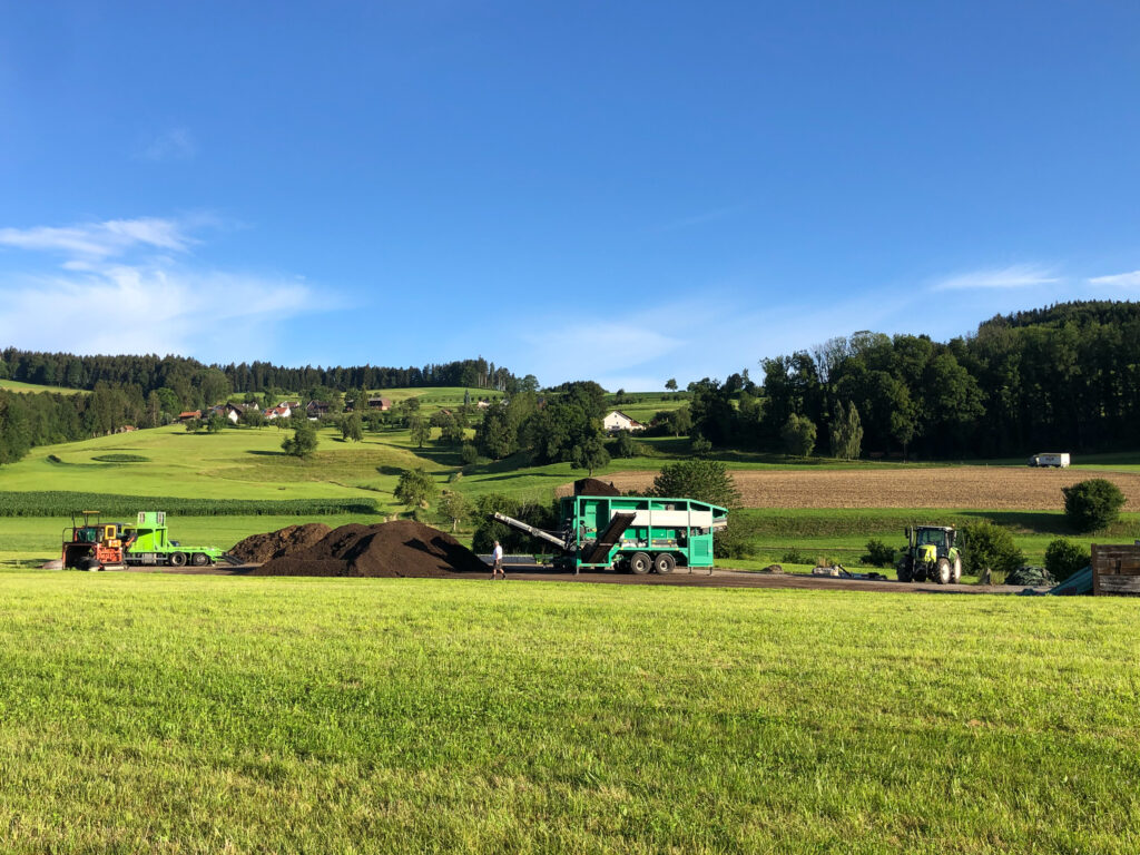 Jährlich verarbeiten wir rund 800 bis 1000 Kubikmeter Grünabfuhr zu Kompost. Etwa 200 Kubikmeter nutzen wir fürs Anmischen unserer eigenen Felix-Erde. Den verbleibenden Kompost setzen wir zur Bodenverbesserung in den Kundengärten ein. Unsere eigene Erde kommt insbesondere bei Rasenflächen, Bäumen, Geranien und Topfpflanzen zum Einsatz.
