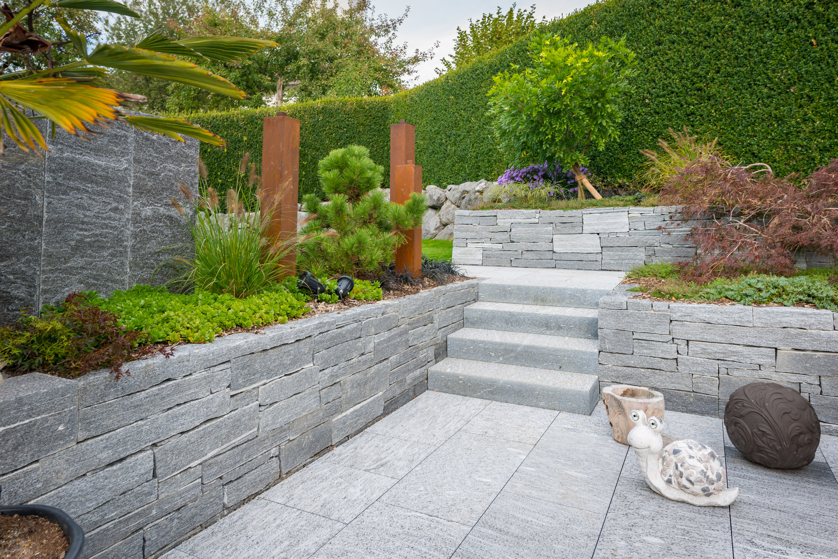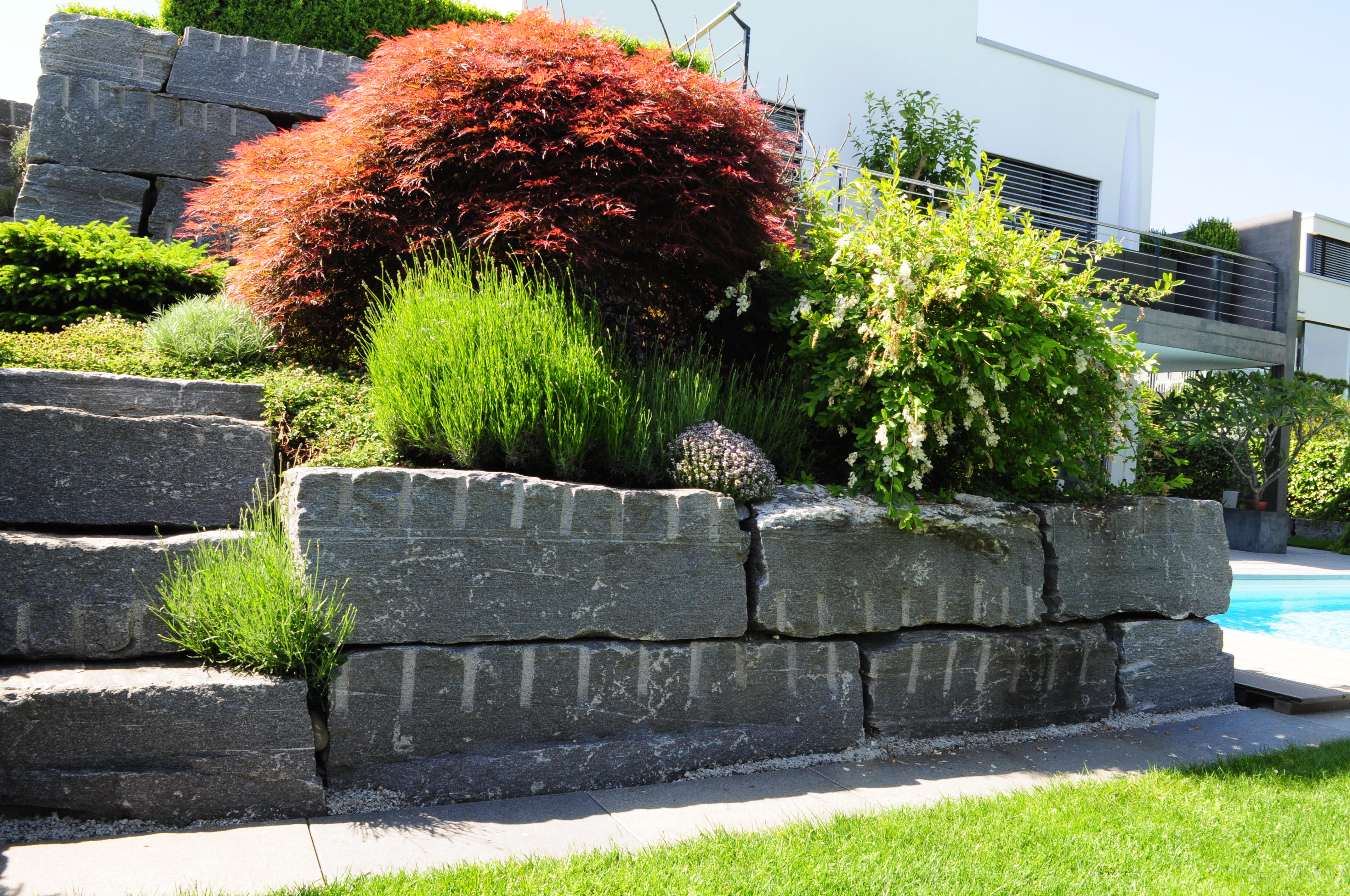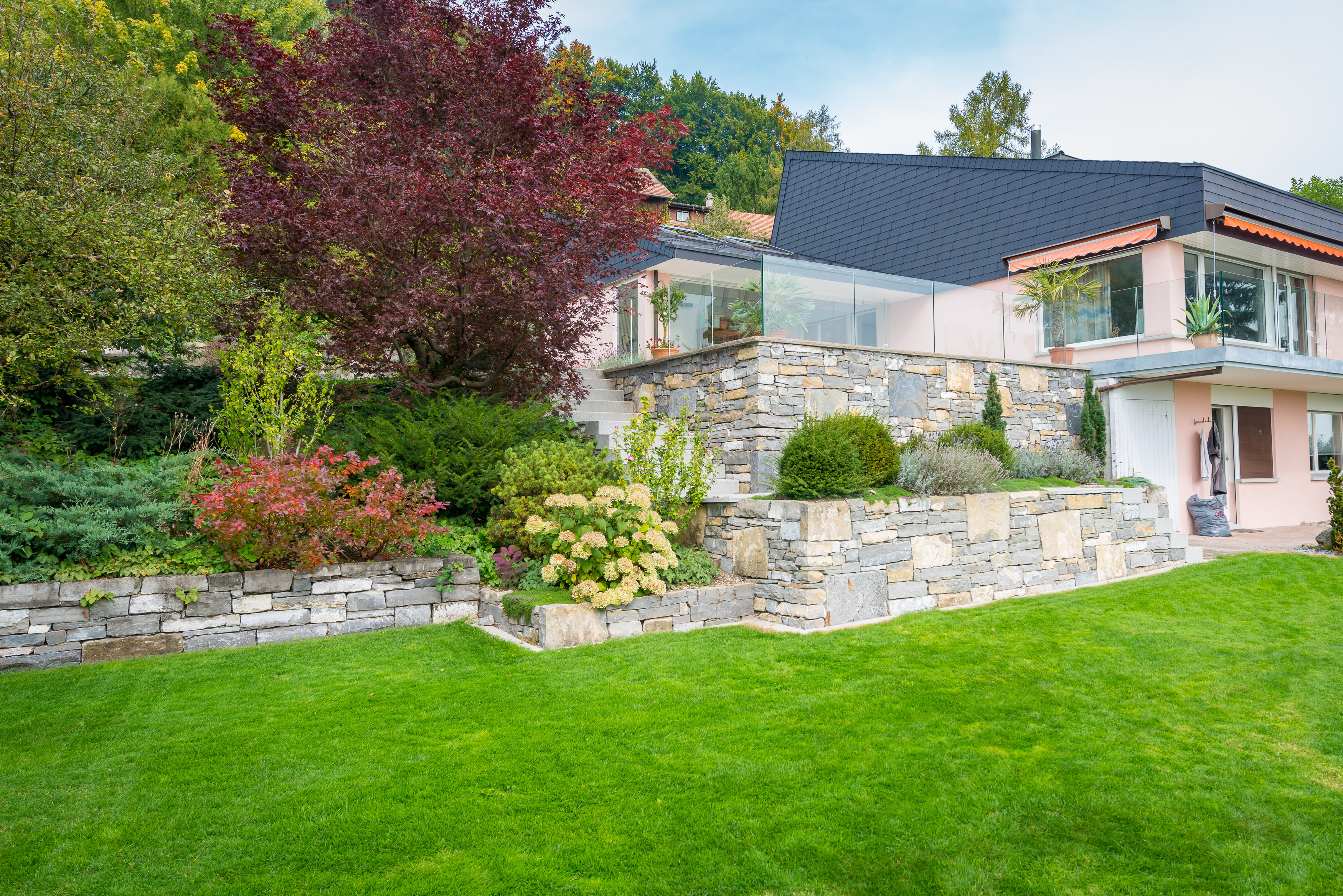 Wir errichten Mauern aus Naturstein oder Betonelementen zur Hangsicherung, zum Auffangen von Böschungen und als Gestaltungselemente. In unserem Steinlager in Wuppenau können Sie auf 6’500 Quadratmetern Fläche eine grosse Auswahl an Schweizer Naturstein von bester Qualität entdecken, unter anderem Rorschacher Sandstein, Guber Naturstein, Calanca-Gneis oder Cristallina aus dem schönen Maggia-Tal. Wer die Einzigartigkeit der Schweizer Steinwelt schätzt, wird bei der Felix Gartenbau AG fündig.