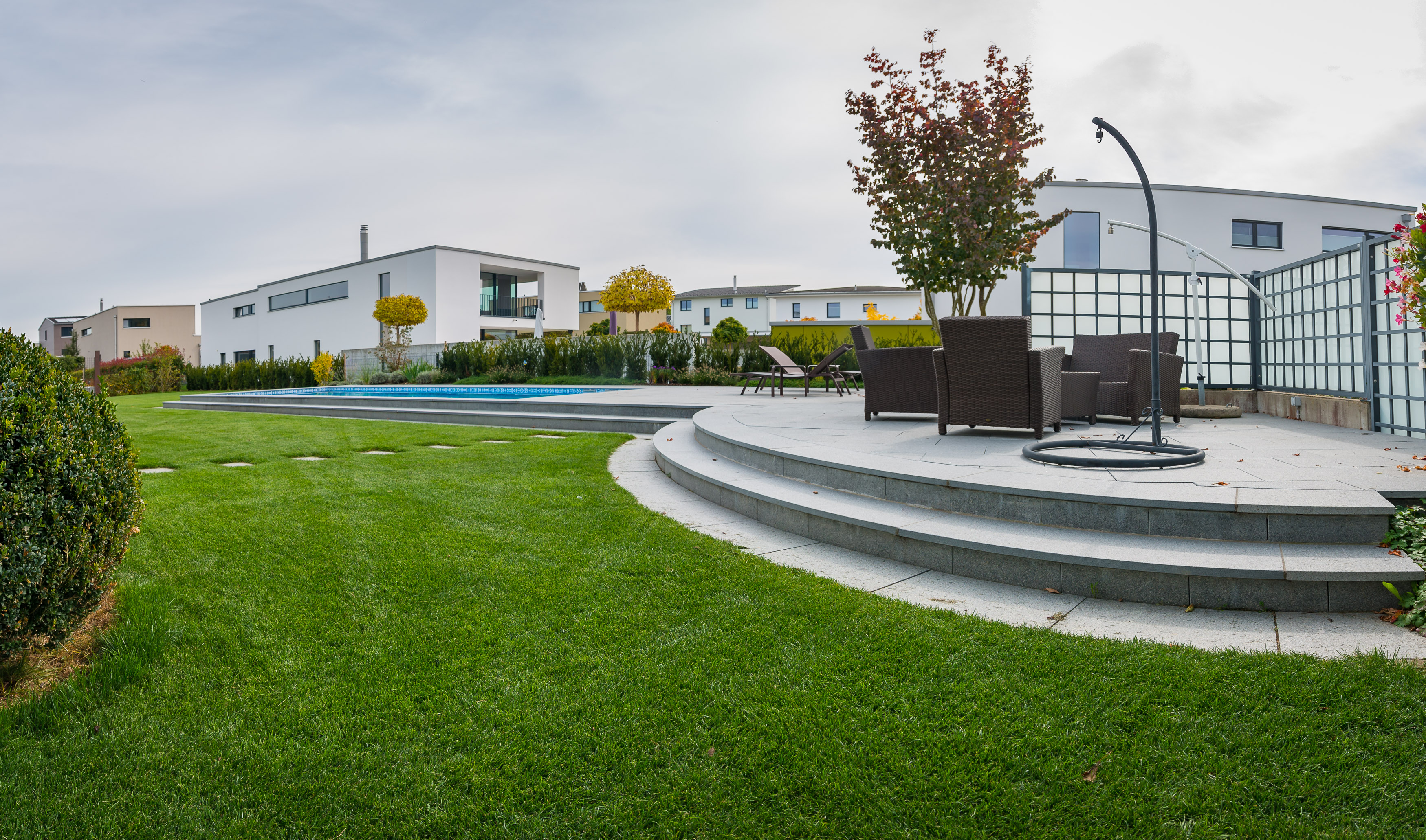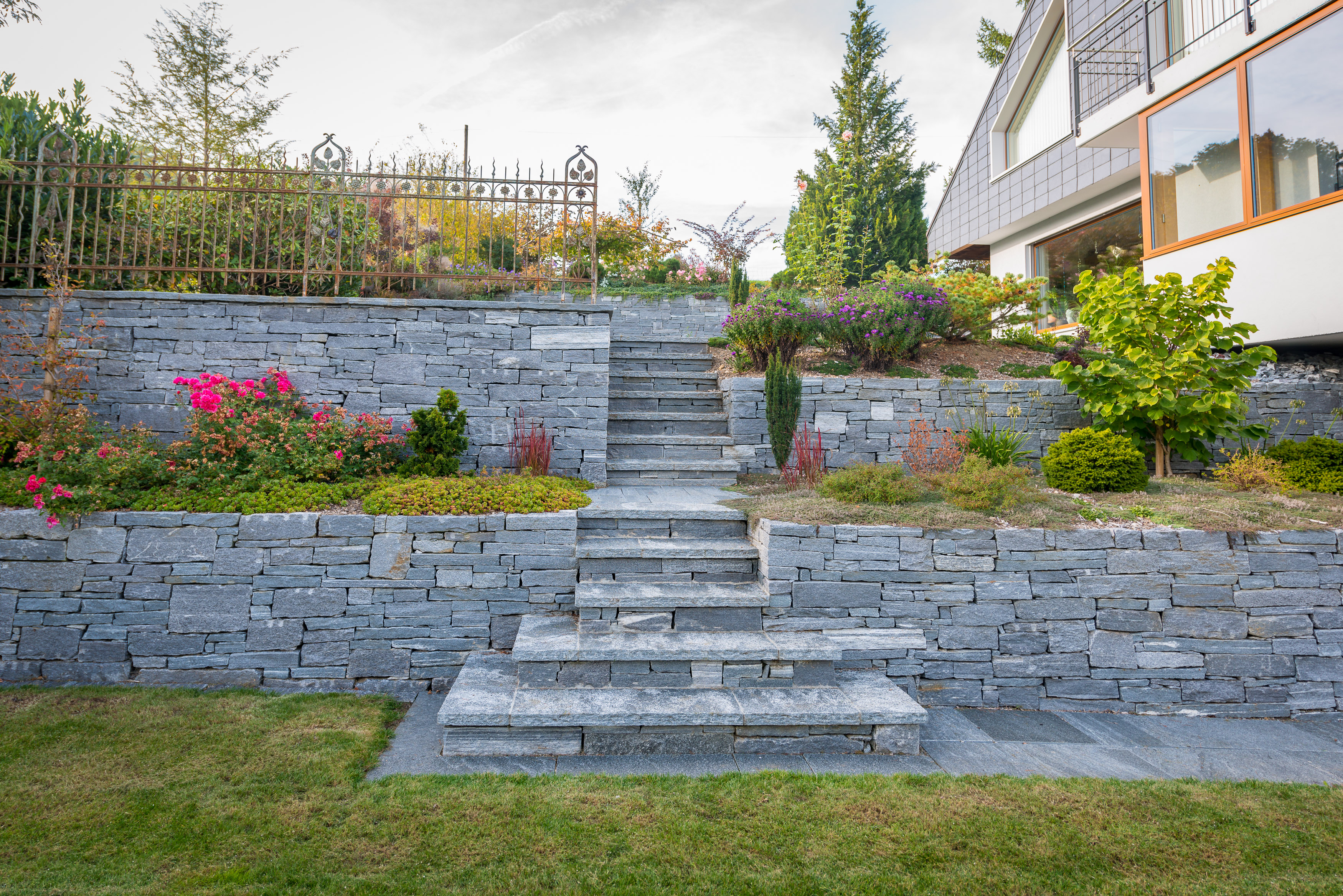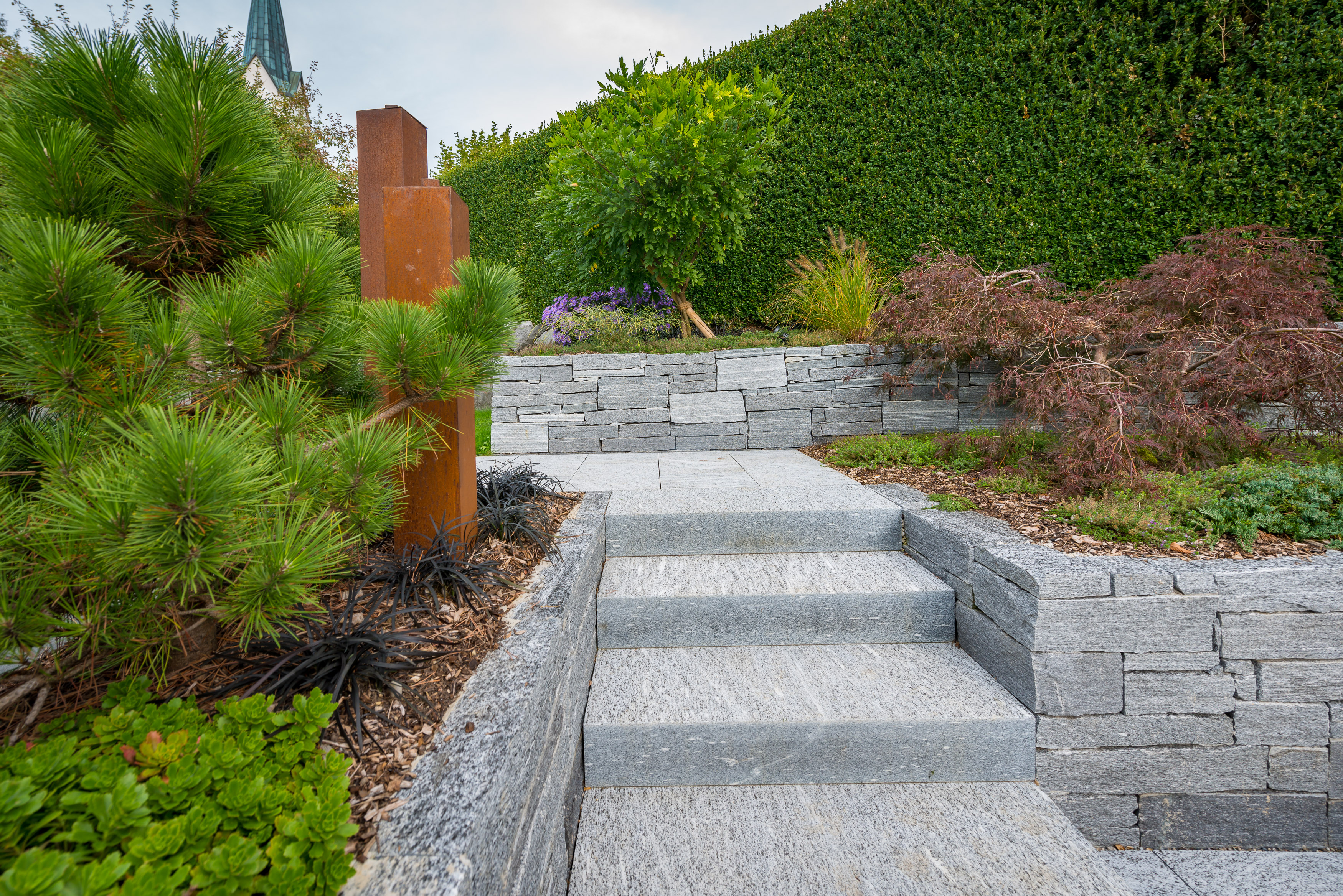 Treppen im Garten gleichen Höhenunterschiede aus und sind strukturierende Elemente, die den Charakter des grünen Wohnzimmers prägen. Egal ob die Stufen aus Beton oder Naturstein gefertigt sind, egal ob eine Blockstufentreppe oder Winkelstufen erwünscht werden – unsere Planungsprofis wissen, welches Element es wo braucht und wie es sich gestalterisch am harmonischsten in Ihren Garten integrieren lässt.