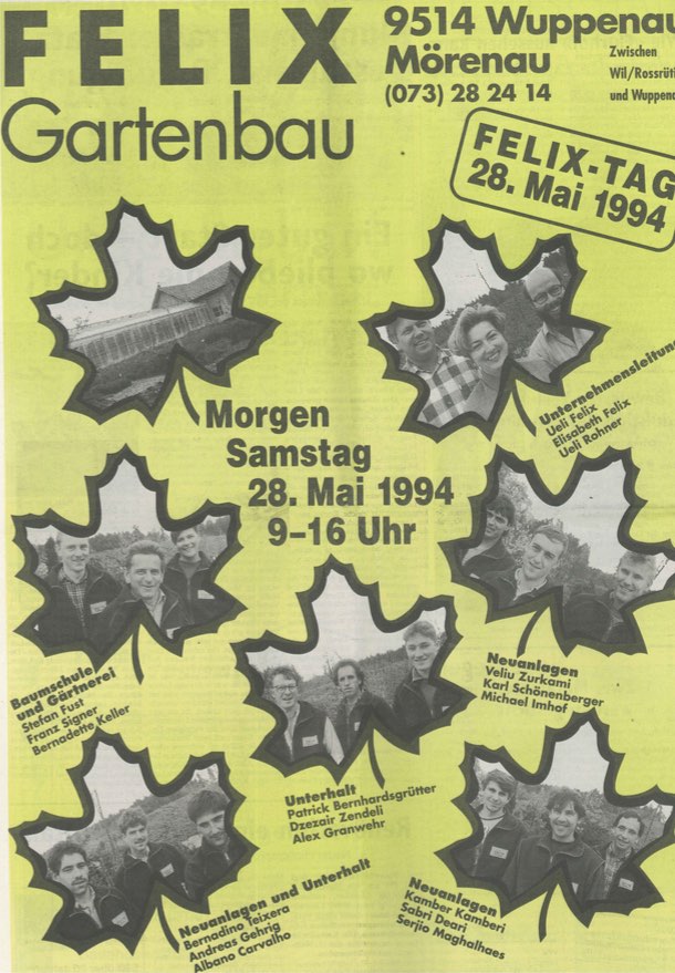 Kaum zehn Jahre nach der Gründung eröffnete die Felix Gartenbau AG einen neuen Werkhof in Mörenau/Wuppenau und feierte mit 20 Mitarbeitenden einen Tag der offenen Tür. Ueli Felix zeigte seine Vielseitigkeit und Offenheit für Neues, als er von 1995 bis 1997 mit seiner Gärtnerei Heilkräuter für die Dr. Dünner AG anbaute. 1996 übernahm der Betrieb die Gärtnerei Bazenheid, ein weiterer Meilenstein für die Eigenständigkeit des Familienbetriebs.