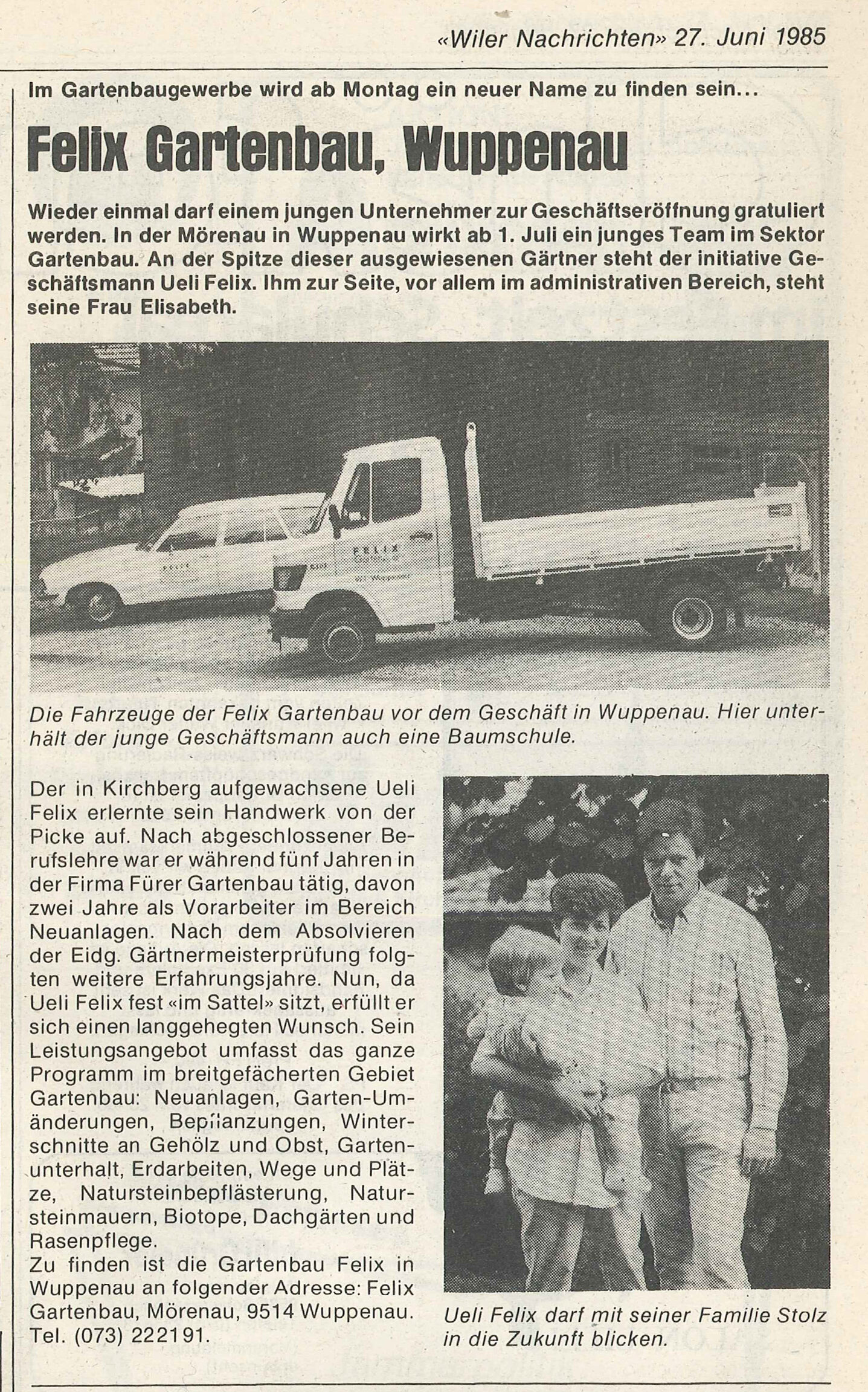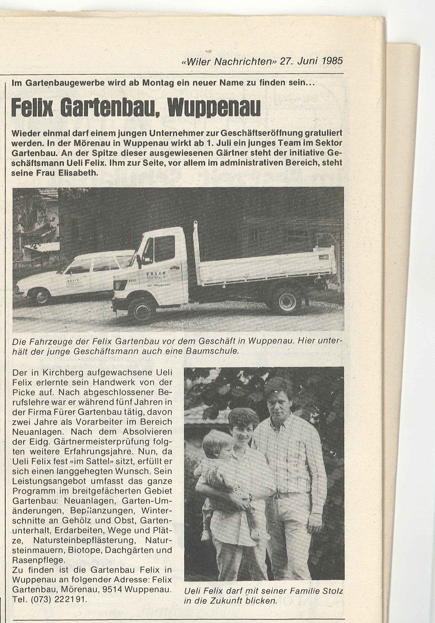 Ueli Felix legte am 1. Juli 1985 den Grundstein für das erfolgreiche Gartenbauunternehmen. Der Familienname Felix ist Programm, denn das Thurgauer Unternehmen kann sich glücklich schätzen: Zu den anfangs drei Mitarbeitenden gesellten sich von Jahr zu Jahr immer mehr Fachkräfte. Schon bald kamen zum Ahornblatt im Logo drei weitere «glückliche» Blätter hinzu, nämlich die Söhne Christoph, Andreas und Thomas.